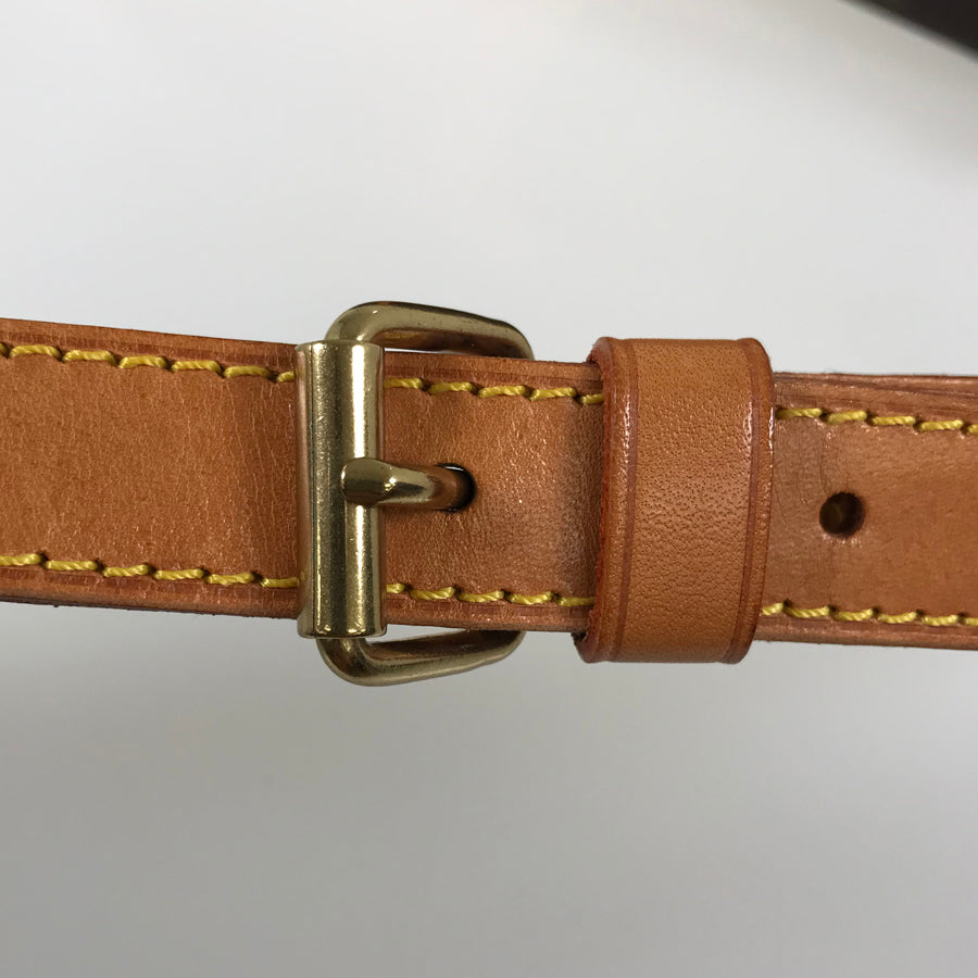 - Strap: The tanned leather has burnt spots, stains, wrinkles, and scrub marks, and the tip is warped.